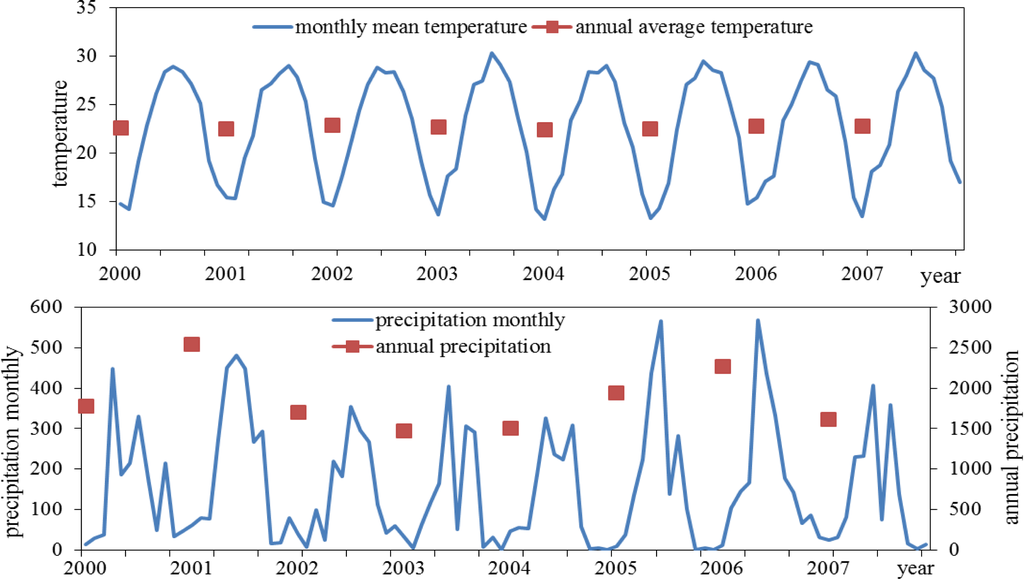 Annual average temperature and total precipitation in Guangzhou from 2000 to 2007.