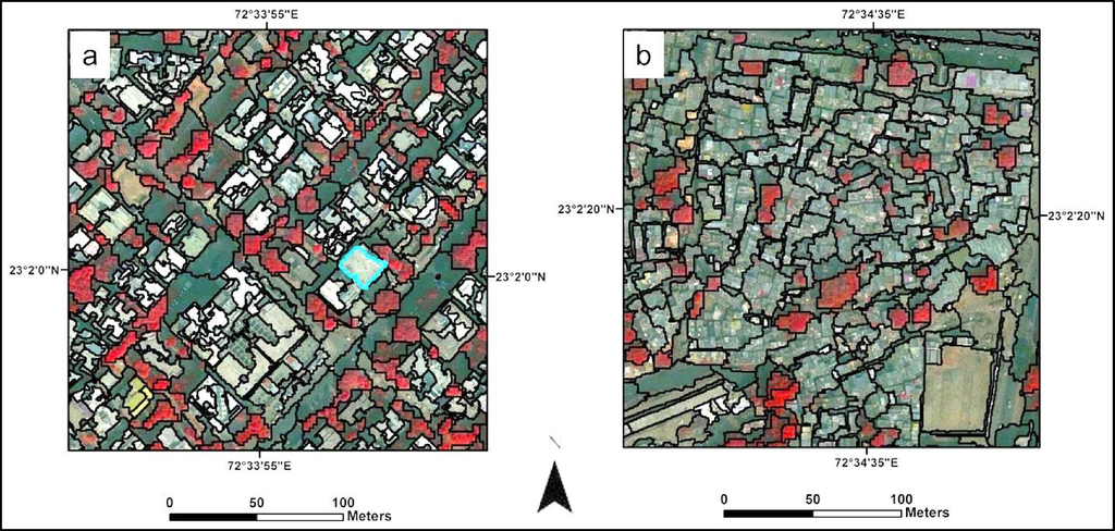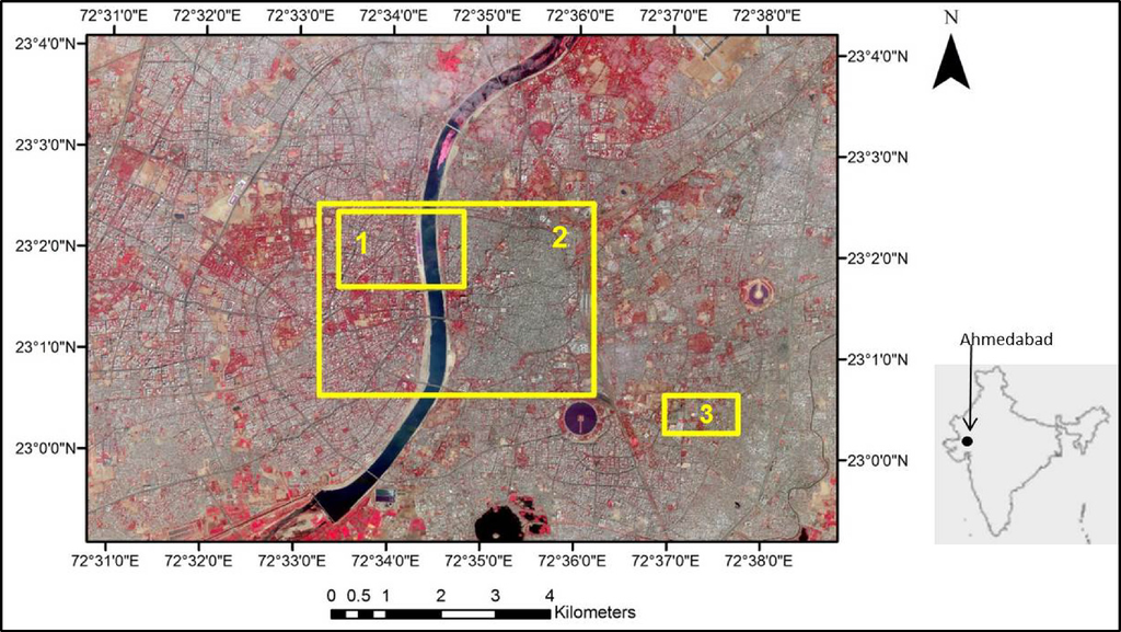 This study adapts the GSO to slums in an Indian city, followed by an OOA-based classification. For wider application of a method, it is important to test its applicability in areas of varying characteristics. Earlier studies have shown that rulesets obtained by OOA methods can be transferred and reapplied to various contexts (subsets of same image or different images) [24,25]. The transferability is defined as the degree to which a particular method is capable of providing comparable results for other images. A ruleset is easily transferable if it requires minimal manual adaptations for different imaging conditions. This study was carried out with GeoEye-1 image of the city of Ahmedabad, India (Figure 2). The objectives of this study are as follows: