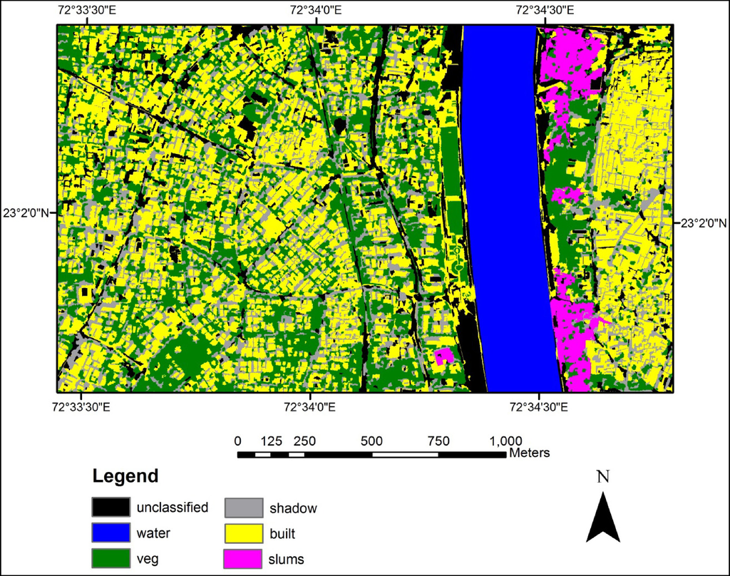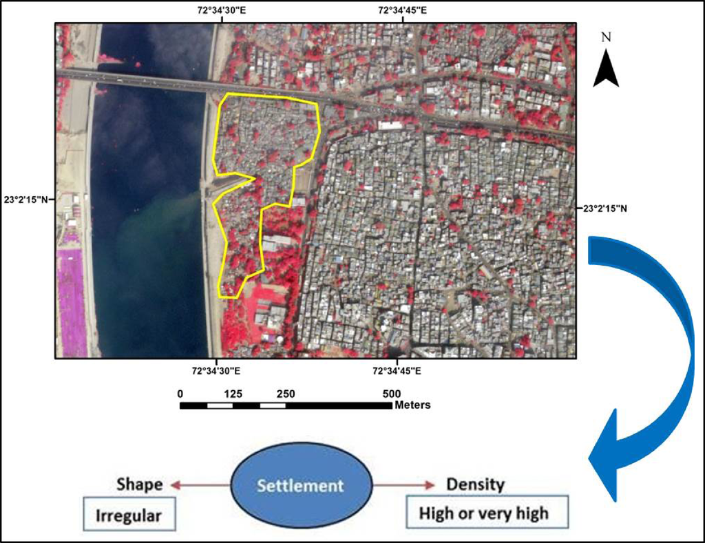 In Ahmedabad, buildings are highly variable in terms of size, color, shape, tone and texture. By means of visual interpretation, using parameters such as building roof color, structure, orientation, density as well as on road characteristics, amounts and patterns of vegetation and open spaces, it was observed that there are many types of built-up areas. For example, the planned residential complexes tend to have buildings with bright white roofs that show a well-organized pattern with regular orientation and spacing, and are often separated by planned green spaces or vegetation. Some areas have buildings with grey, whitish grey or brown roofs with variable green spaces between them, and their size and orientation varies. In contrast, buildings in the Old City are relatively old, the oldest ones dating back to 15th century. They show a haphazard pattern with high density, variable orientation, and almost no vegetation and open spaces. In the absence of local knowledge, these buildings may be incorrectly interpreted as slums. Slum detection studies from satellite images need to address the problem of formal-looking informal areas, and informal-looking formal building clusters, as these may lead to severe misclassification. By formal, we refer to areas that are planned by the concerned city authorities. Informal areas generally develop organically, often built by residents themselves without approval from the authorities. Slums are often referred to as informal areas in previous literature [5,10]. The Old City is a good example of informal-looking formal building clusters. It is thus required to study and understand the context in terms of spatial characteristics of different built-up areas.