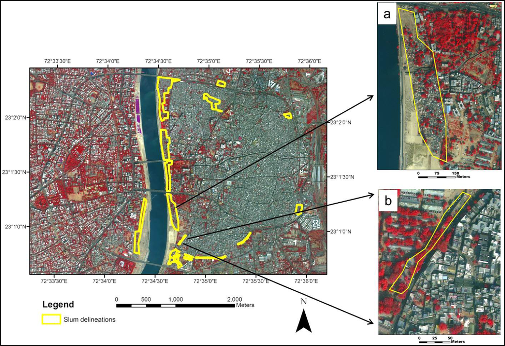 Ahmedabad, India’s seventh largest city with a population of approximately 5.5 million, covers an area of 205 km2 [26]. The city is divided into an eastern and a western part separated by the Sabarmati river. The eastern part is the Old City and includes the central town Bhadra that is characterized by the barricaded pol system of densely clustered buildings. The Old City is the historical core and is also known as “Walled City”. It was found in 1,411 AD and grew over time. The western part includes educational institutions, modern buildings, well-planned residential areas, shopping malls, multiplexes and new business districts. Slum areas are found in both parts and consist of small, self-constructed building units with roof material of tin, thatch, plastic, concrete or clay tiles [27], forming small pockets along the river and other parts of the city (Figure 1). In 2001, approximately 25% of the total population of the city lived in slums [28].