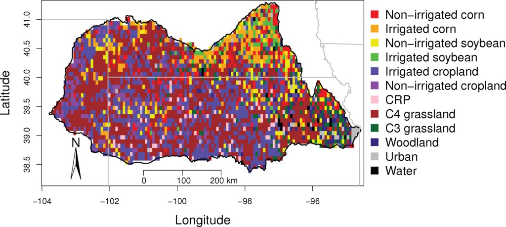 The central US is an area of significant agricultural production, and for this study we focus on the Kansas River Basin (KRB), which is located in northern Kansas and extends into southern Nebraska and a portion of eastern Colorado (Figure 1). Across the KRB, there is a profound precipitation gradient extending from dry in the west (400 mm/yr) to moist in the east (1,000 mm/yr) [31]. The current ecosystems are highly influenced by local land use management strategies including balancing the increasing demand of food and biofuel production, which will extend potential impacts of the environmental changes, both in the native and agricultural lands. Most parts of the KRB are agricultural and prairie. Short-grass prairie is in the west, mixed prairie is in the center, and tall-grass prairie is in the east. By landcover type, croplands (40% of KRB) are primarily located in the central to west, grasslands (41% of KRB) are distributed primarily in the east, and woodlands or forests (4% of KRB) are only found as riparian along river valleys in the east [32]. It is an opportune area to address the questions of ecosystem dynamics changes through time, because unlike the top corn producing areas, land in the KRB is used for a wide variety of agricultural uses (i.e., corn, soybean, Conservation Reserve Program (CRP), grazing, etc.) as well as natural landcover types such as C3 and C4 grassland. This basin is likely to undergo changes from a significant number of landcover types as demand for one or two crops (i.e., corn and soy) increases. There are additional uses competing for land surface area including woody encroachment and urbanization.