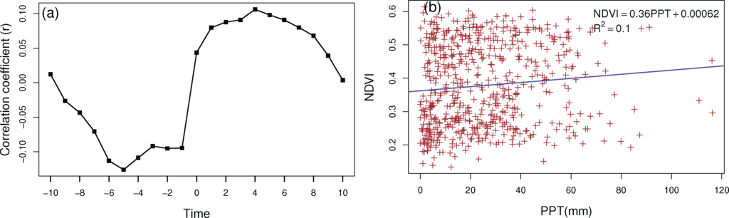 We compared the proposed method and metrics with other traditional statistical analysis as well. First is the correlation analysis: we examined the relationship between NDVI and different time lags of PPT by calculating correlation coefficients between NDVI of the various periods and corresponding precipitation (e.g., current period of NDVI and previous period PPT). However, the results did not show any significant correlation between NDVI-PPT within KRB (−0.1 < r < 0.1, Figure 4a). Secondly, we have tested if NDVI and PPT exhibited non-stationarity during the study period by linear regression analysis. Again the results had a weak relationship between NDVI and PPT (r2 = 0.1), shown in Figure 4b with the correlation between 15-day composited NDVI and 15-day totals PPT over the 25 years.