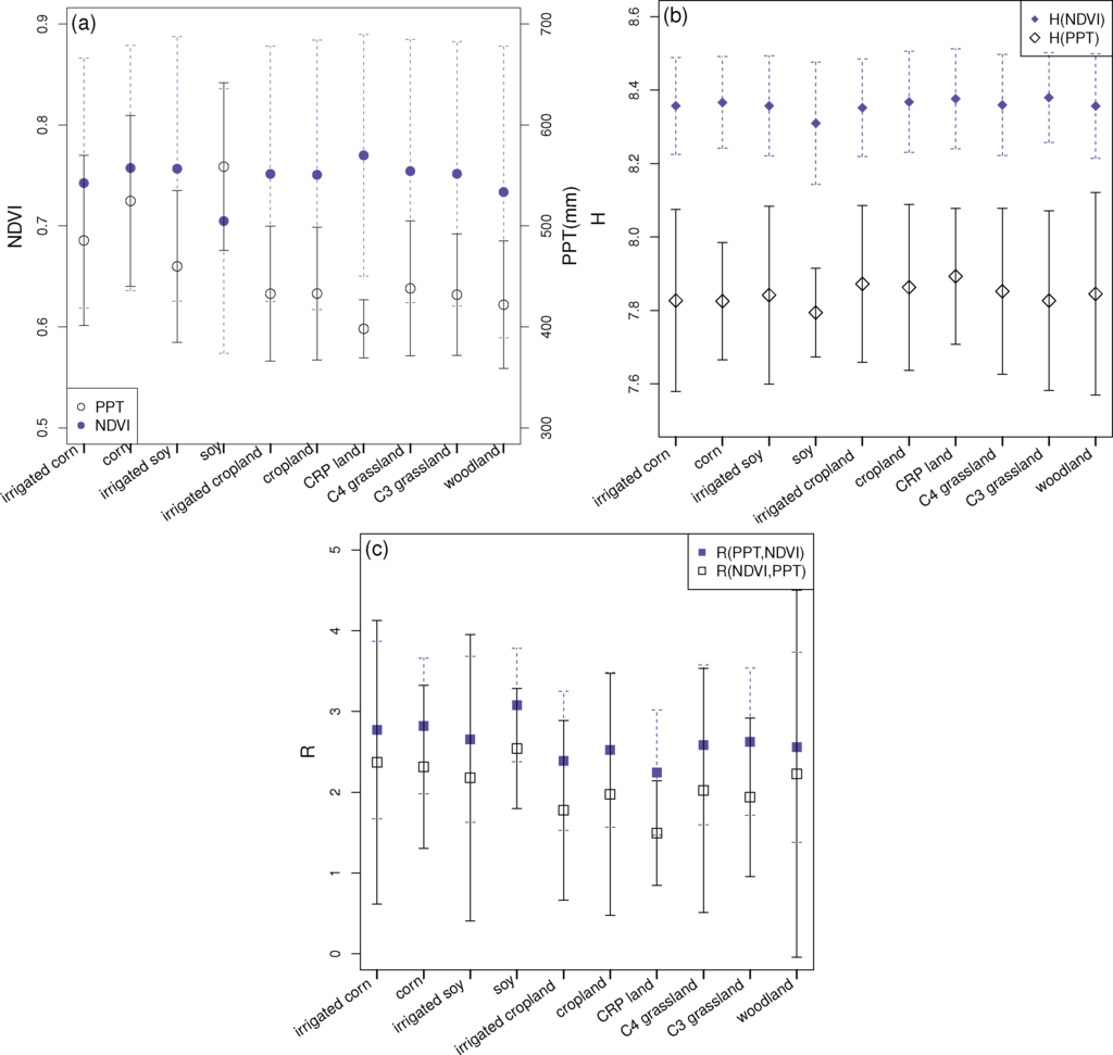 We examined the variability of the entropy of PPT and NDVI as a function of landcover type (Figure 5b). The variability showed a similar distribution as NDVI for each landcover type compared with Figure 5a, but did not present as much difference among landcover types with reduced standard deviation of entropy in NDVI spectra for each type. H(PPT) slightly varied by landcover as well. We also calculated how much of the information in the vegetation distribution was related to the precipitation variability within each landcover type (Figure 5c). Clearly the R(NDVI, PPT) values of ten landcover types were all lower than R(PPT, NDVI), which implies less additional information is needed to represent vegetation by the given precipitation rather than predict the PPT from the NDVI. Fluctuations of R(PPT, NDVI) and R(NDVI, PPT) among all landcover types were also approximately equal.