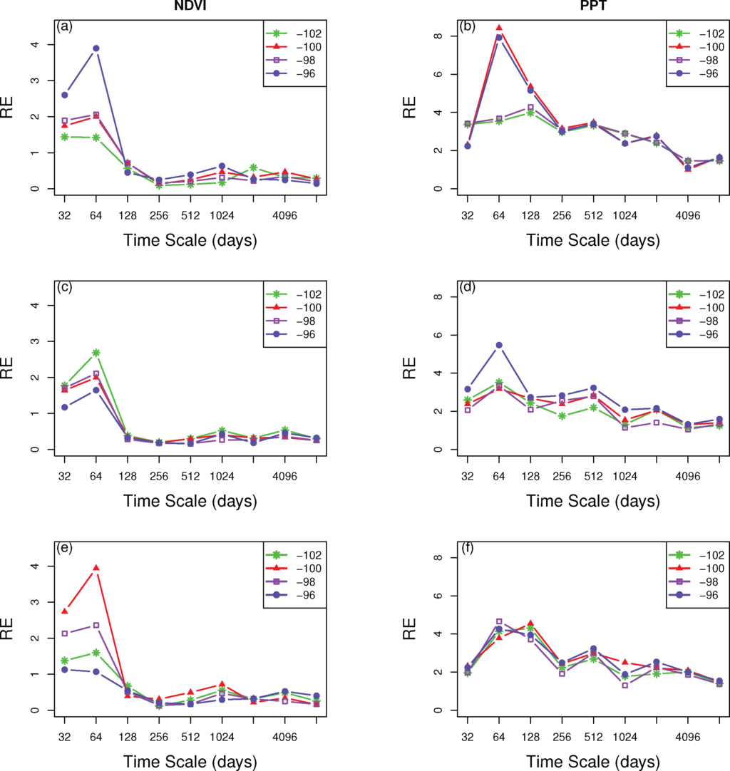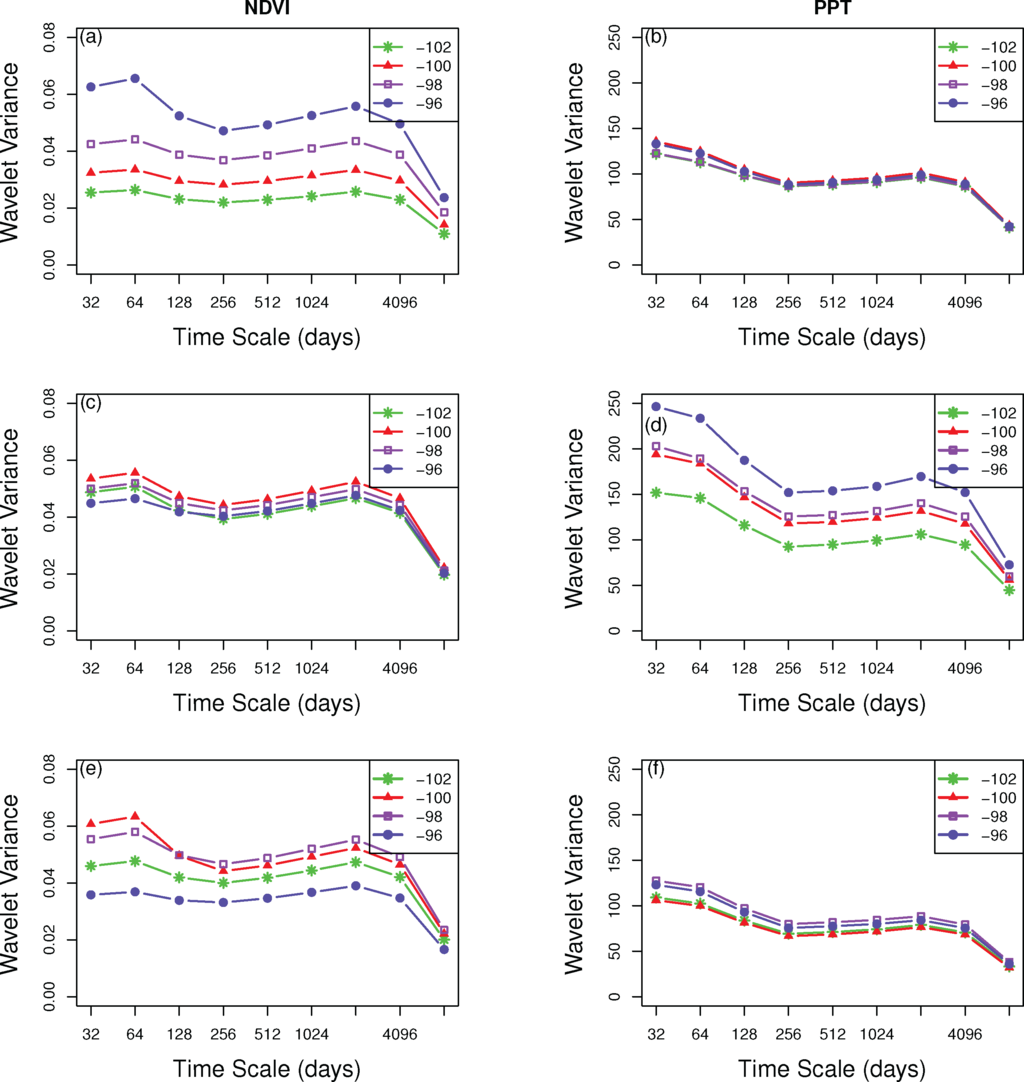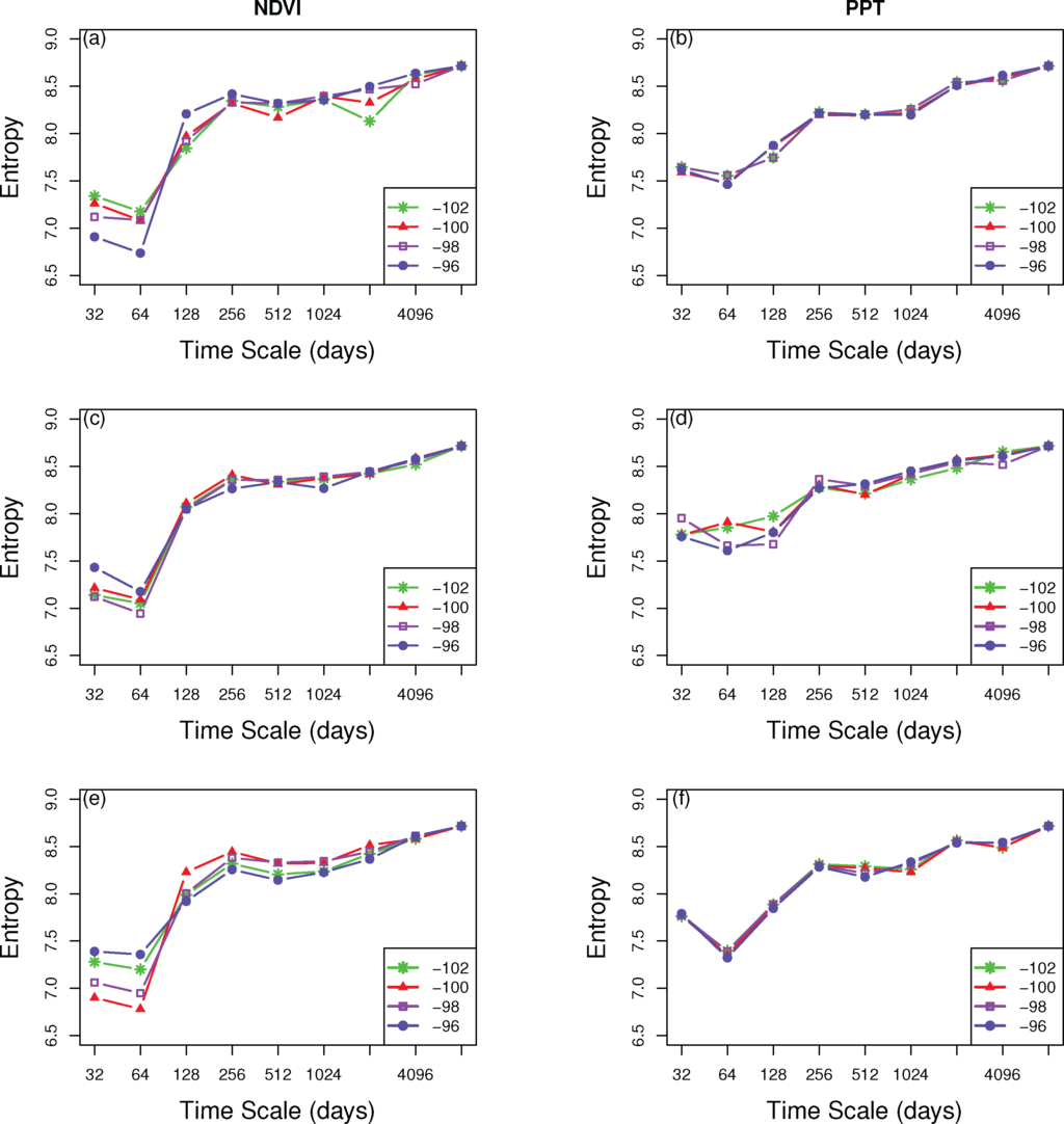 Next, we conducted a wavelet multi-resolution analysis to calculate the multiscale entropy for the PPT and NDVI. The general behavior was increasing entropy with increasing time-scale. The marked increase of NDVI was in the 128-day (seasonal) scale and slowly went up through longer time-scales. More variance was found up to the seasonal scale for the entire basin and selected landcover types (irrigated corn and C4 grassland). Within the seasonal scale for the entire basin (Figure 7a), NDVI spectra showed that there was a decreasing trend from west to east. Irrigated corn varied more in the east region (96 W) (Figure 7c), while C4 grassland in the far west and east regions exhibited less variation than the central part (Figure 7e).
