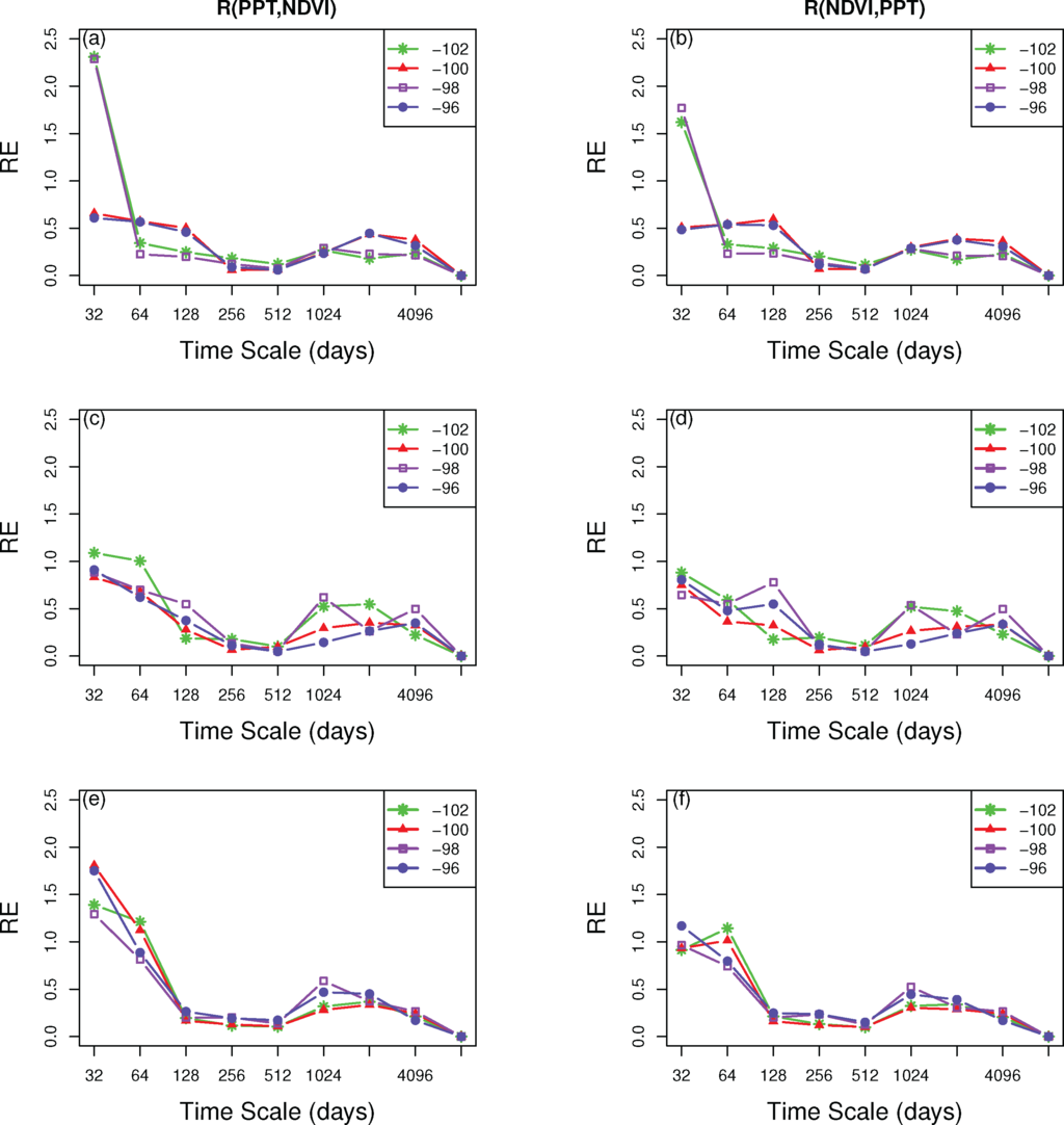 In addition, we also calculated the relative entropy between NDVI and PPT as a function of scale to examine how informative different time scales of the PPT signal were at determining the NDVI data and vice versa. The results of R(PPT, NDVI) showed that the 32-day (monthly) scale was contributed the least information (had the highest R value). Two distributions were noted across the basin (Figure 9a): (1) at 98 W and 102 W, there were really high R values at the 32-day (monthly) time-scale and decreased as a function of time scale; (2) two peaks showed at 32-day and 2,048-day time-scale, at 96 W and 100 W, respectively. Longitudinal distributions of irrigated corn (Figure 9c) were approximately the same but not consistent at the 64-day (bi-monthly) time scale and longer time-scales. Irrigated corn also showed slightly higher R(PPT, NDVI) at the 256-day and 1,024-day time scales. C4 grassland looked similar across the whole basin (Figure 9e) with higher values in 32-day (monthly) and 64-day (bi-monthly) time scales.