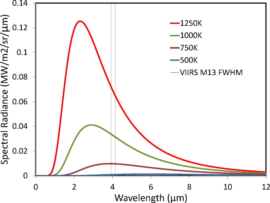 Following Dozier’s lead, the standard fire product from MODIS is processed from a pair of spectral bands (MWIR and LWIR) [6,7]. The product indicates the pixels containing hot sources, but provides no estimate of the temperature or source size. In lieu of Planck curve fitting, the MODIS active fire product provides an estimate of Fire Radiative Power using Kaufman’s 1998 formula [8], empirically derived from field observations of fuel consumption rates for vegetation fires ranging from smoldering (600 K ± 100 K) to flaming (1,000 K ± 200 K). At present, the VIIRS active fire product simply indicates the pixels with hot source detection.