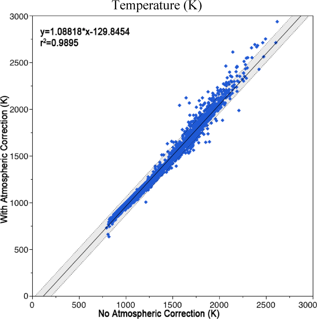 To examine the effects of atmospheric correction on the combustion parameters we examined plots of the temperature, source size and radiant heat with and without atmospheric correction. In the case of temperature and radiant heat, atmospheric correction results in a highly linear shift in the estimates (Figures 10 and 11). This is good news in that it indicates that non-atmospherically corrected Nightfire data could potentially be shifted to achieve the benefit of an atmospheric correction without the computational burden. The source area estimates are more heavily impacted by atmospheric correction (Figure 12). This is attributed to variability in the ESF terms derived from the Planck curve fitting.