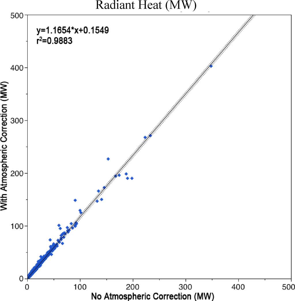 Nightfire radiant heat (RH) was compared to MODIS Aqua Fire Radiative Power (FRP) for 471 individual clusters of fire detections observed during a major outburst of burning in Sumatra which occurred on 19 June 2013. The units for RH and FRP are the same (MW). The two sensors collected data over Sumatra within six minutes of each other. The analysis was confined to land since offshore gas flare detections are excluded from the MODIS product. FRP and RH gridded images were produced at 15 arc second resolution. The MODIS active fire product cloud masking procedure was applied to the Nightfire data to further narrow differences between the two datasets. An automatic clustering algorithm identified overlapping Nightfire and MODIS cloud-free pixel clusters and summed the MW signal. Figure 14 indicates that the MODIS FRP and Nightfire RH are highly correlated.