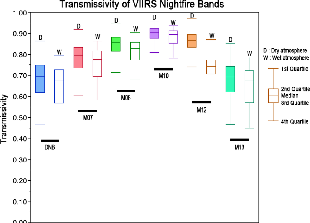 Another test was performed to compare the transmissivity of the six spectral bands used in Nightfire for two distinctly different atmospheres: wet vs. dry. The MODTRAN model was run for Nightfire detections in the Iraq region (dry atmosphere) and Nigeria region (wet atmosphere). The transmissivities were analyzed to identify the median and quartiles. For each spectral band the transmissivities through the wet atmosphere are lower (Figure 13). The band with the highest transmissivity is M10, with a median near 90% transmissivity for both the wet and dry atmosphere. In addition, the quartile range of transmissivities is narrowest for the M10 spectral band. In contrast, the DN Band M13 have median transmissivities near 70% and wide dispersion in transmissivities, as indicated by the quartiles. Inclusion of the M10 spectral band in the Planck curve fitting may explain the relatively minor atmospheric effects on temperature and radiant heat estimates shown in Figures 10 and 11.