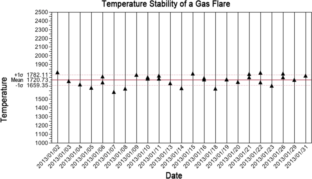 The primary combustible gas feeding the typical gas flare is methane. The temperature of a flare is largely determined by the composition of the gases and combustion efficiency. It is known that the quantity and composition of gases dissolved in petroleum in an oil field change slowly over the production lifetime. Based on this, it is reasonable to expect that over a time span such as a month, the temperature of a gas flare would be largely stable. Figure 16 shows the temperature of a gas flare in Iraq, with thirty observations in the month of January 2013. The temperature is stable, with an average of 1720 K and a standard deviation of 61 K.