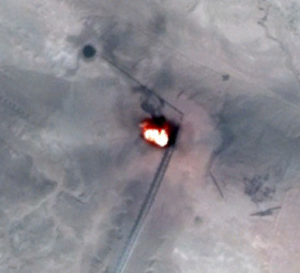 Gas flares should be identifiable based on their high temperature and temporal persistence. To test the ability of Nightfire data to correctly identify gas flares, a validation was conducted using a cloud-free composite of Nightfire data from January 2013. The detections were sorted to yield a set that had average temperatures greater than 1,600 K and detection in at least 20% of the cloud-free observations. This subset was converted into a KMZ for display using Google Earth. For each point, an analyst reviewed the base image present in Google Earth to see if a gas flare or gas flare infrastructure features could be identified (e.g., Figure 17). If no gas flare could be located, the analyst noted the type of base image data and year of the base image data. The points for which no gas flare could be found in Google Earth were filtered to remove cases where the base imagery had coarse spatial resolution (e.g., Landsat) or the image data were older than 2012. The filtered set was then used to discount the percent accuracy of the gas flare identifications. The results are presented in Table 4. The overall accuracy was 99%, indicating that temperature and temporal persistence can be used to filter Nightfire detections for the identification of gas flares.