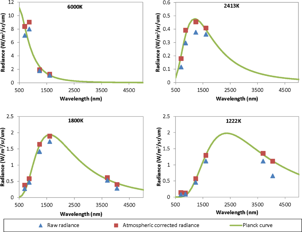 There are two main branches to pyrometry: full field-of-view and sub-pixel. In full field-of-view pyrometry, the object being measured fills the entire field-of-view of the sensor. The temperature of the object can estimated based on the emitted radiance in a single spectral channel (Figure 1). This technique relies on the progressive increase in emitted radiance as the temperature of an object increases, as expression of the Stefan-Boltzmann’s Law. There is no need to locate the wavelength of peak radiant emission, since the Planck curves do not cross or intersect. Full field of view pyrometry can be achieved with ground-based pyrometers and with high spatial resolution remote sensing data. There are three considerations in the selection of a suitable spectral band for full field of view pyrometry: (1) The spectral band should cover a bandpass where there are significant changes in emitted radiance for the temperature range of interest, (2) the bandpass should be located in a relatively clear atmospheric window, and (3) the bandpass should be largely free of solar contamination, to work well, both day and night. For day and night full field of view pyrometry, the spectral range of choice is in the 3–5 μm atmospheric window, which has low solar irradiance and measureable radiant emissions spanning a wide range of temperatures.