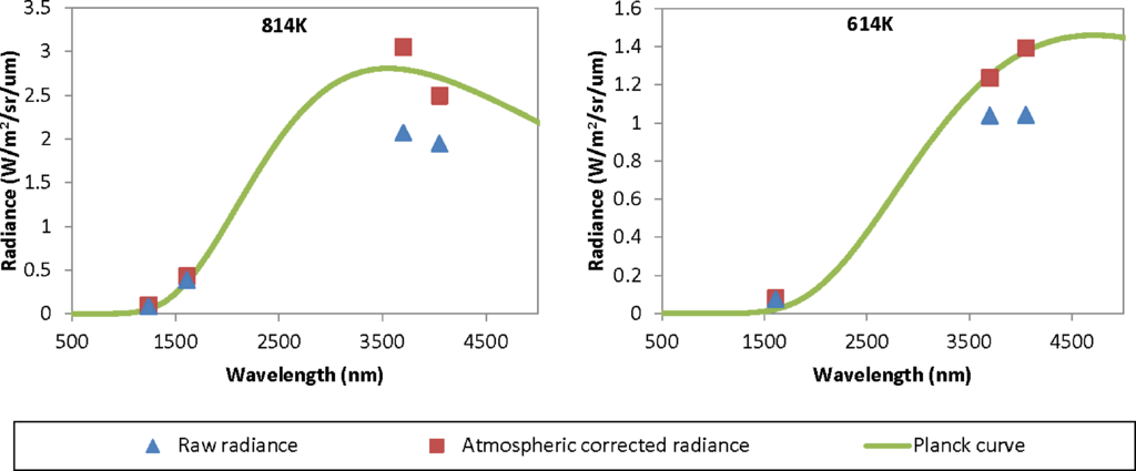 On Figure 8 there is a set of seven pixels that fall below the red line, labeled as “misfits”. At the low end of the temperature range (under 700 K), the radiance in M10 is low compared to M12 and M13. The Planck curve fits for misfit pixels do not pass through or even close to the M10 radiance. The results are temperature estimates that are low, pulling the pixels below the red line in Figure 8. It may be possible to address this problem with an adjustment to the Planck curve fitting procedure to add weight to the M10 radiance.