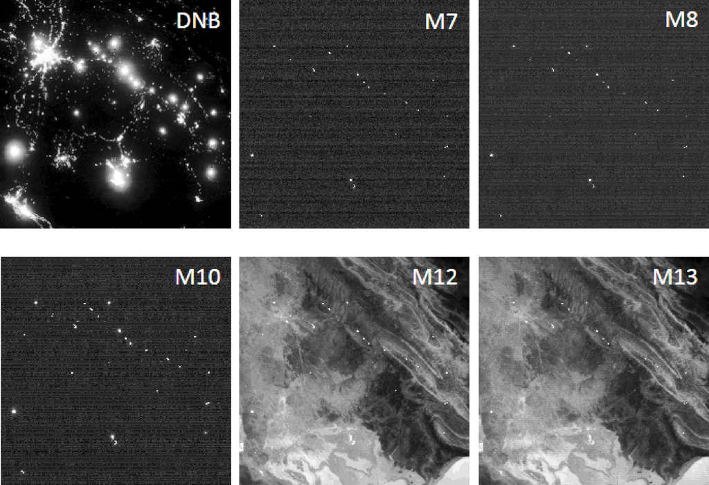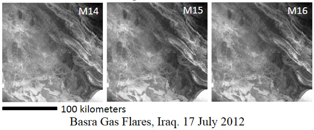 When VIIRS data became available, the authors decided to examine images from each of the spectral bands collected by VIIRS to discover which ones may be useful for detecting and characterizing gas flares. The daytime collections looked very similar to MODIS. At night, VIIRS collects data in nine spectral bands (Table 1 and Figure 2). In reviewing nighttime images collected over well-known gas flaring regions, it was discovered that gas flares have a strong signal in data collected by the 1.6 μm channel (M10) at night. The flare features are generally too weak to be detected in daytime M10 data due to solar reflectance. At night the vast majority of the M10 pixels are recording system noise, which is dominated by dark current, the signal a radiometer records when light is blocked from entry into the aperture. Pixels with hot sources stand out clearly against the system noise in nighttime M10 data. These 1.6 μm nighttime phenomena have been previously reported with ATSR data [10,11]. The M7 and M8 data collected at night by VIIRS show a similar capability to detect pixels containing hot sources. The low light imaging day-night band (DNB) detects both electric lighting and combustion sources. Some of the larger flares can be identified in the mid-wave infrared images (M12 and M13), however algorithmic detection here is complicated by scene feature content, which is dominated by temperature differences between different surface types and clouds. Hot pixel detections decline as wavelength increases, with very little expression of hot pixel radiance in the LWIR channels (M14, M15, and M16).
