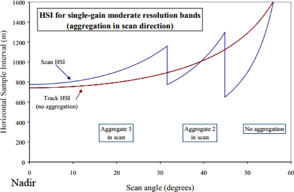 The VIIRS constrains the expansion of the M-band pixel footprints from nadir to the edge of scan by systematically varying the number of pixels aggregated on-board [12]. In the region ±31.72 degrees out from nadir, three pixels are aggregated (Figure 3). The instrument then switches to aggregate two pixels out to ±44.86 degrees. In the final segment of the scan (out to ±56.28 degrees) no aggregation is used and the instrument records signal from single pixels.