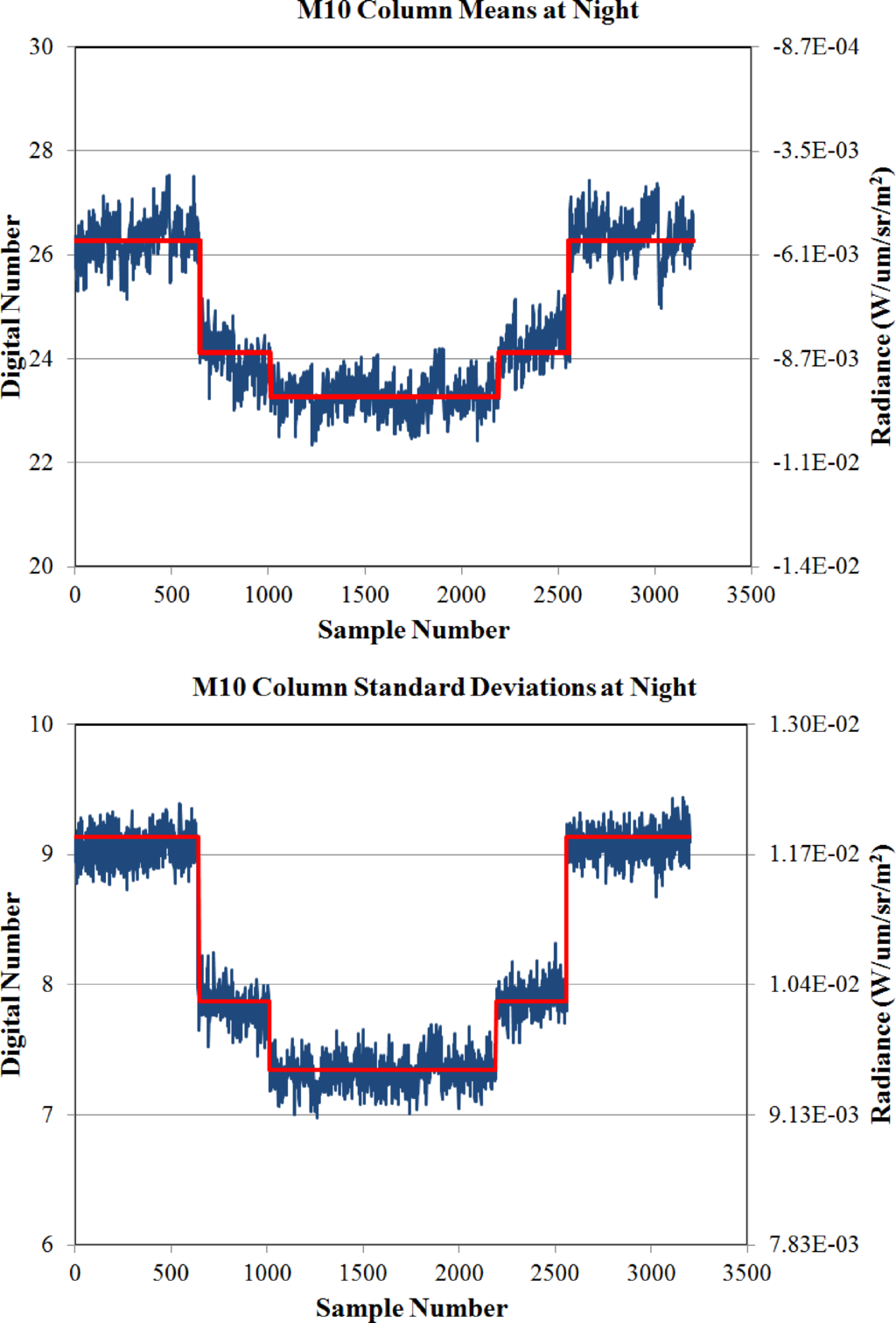 While successfully controlling the footprint size, this aggregation scheme alters the signal-to-noise ratios in the aggregation zones. To make Nightfire as sensitive as possible, three sets of means and standard deviations are calculated on each SDR file, pooling the pixels from the three pixel aggregation zones. Obvious hot pixels are excluded from the background pixel set by screening out digital values over 100. Both the mean and standard deviation become progressively higher as the number of pixels aggregated shifts from three, to two, and one (Figure 4). Candidate hot pixels are identified as those with digital numbers exceeding the mean plus four standard deviations. Details of the M10 hot pixels are recorded in a comma-separated value (CSV) file, including the unsigned integer, radiance, source file name, line and sample numbers, latitudes and longitudes, quality flags, and other metadata.