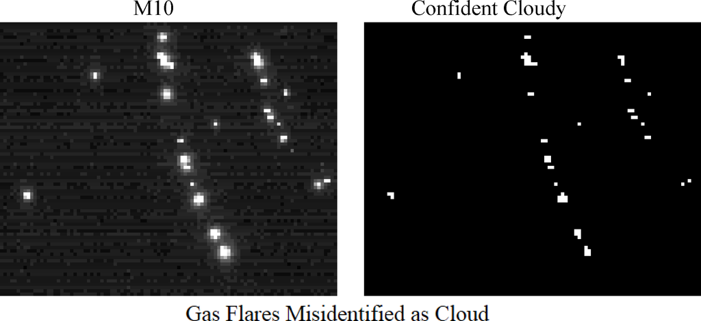 In examining the cloud mask, it was found that gas flares are frequently misidentified as having cloud cover (Figure 5). These are isolated patches marked as “probably cloudy” or “confidently cloudy”. This may be a type of spectral confusion. A cloud-clearing algorithm is run to reset the cloud mask values for isolated clouds associated with M10 hot pixels.