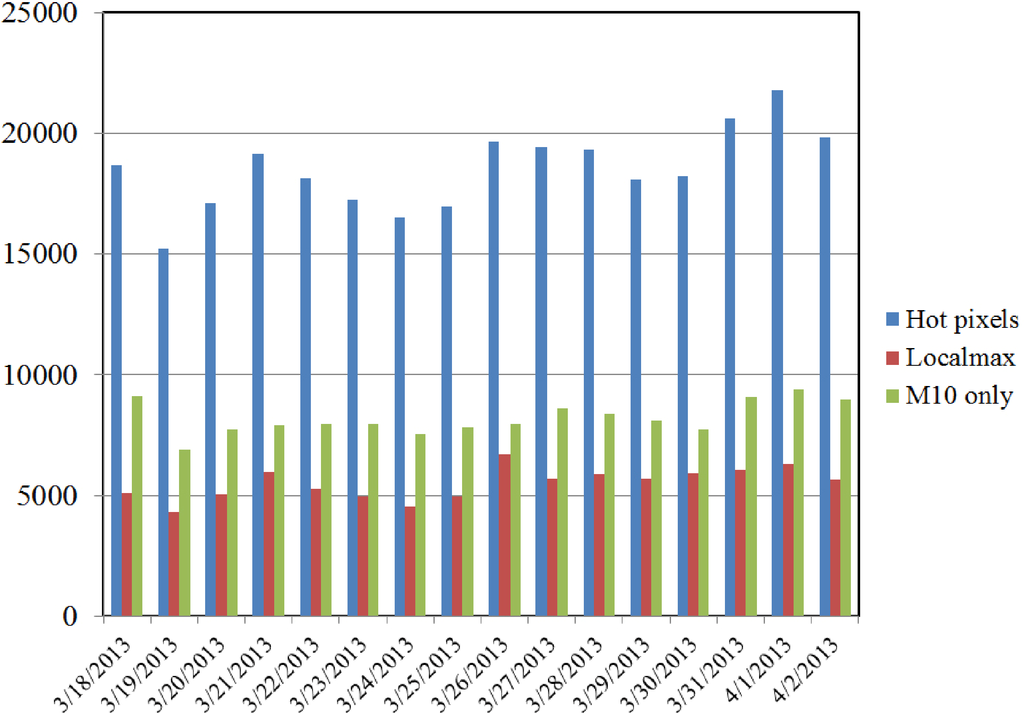 The number of confirmed (multiband detection) daily hot pixel detections ranges from 15,000 to 22,000 (Figure 6). The number of local maxima is typically 30% of the confirmed hot pixel tallies. The chart also shows tallies of pixels with only an M10 detection, where the detection of a hot pixel could not be confirmed by hot pixel detection in any other spectral band. These pixels are recorded in the CSV and marked as unconfirmed using a quality flag. The number of unconfirmed M10 detections average 44% of the confirmed detections. While many of the unconfirmed M10 detections are noise, some are genuine hot pixels with weak signals.