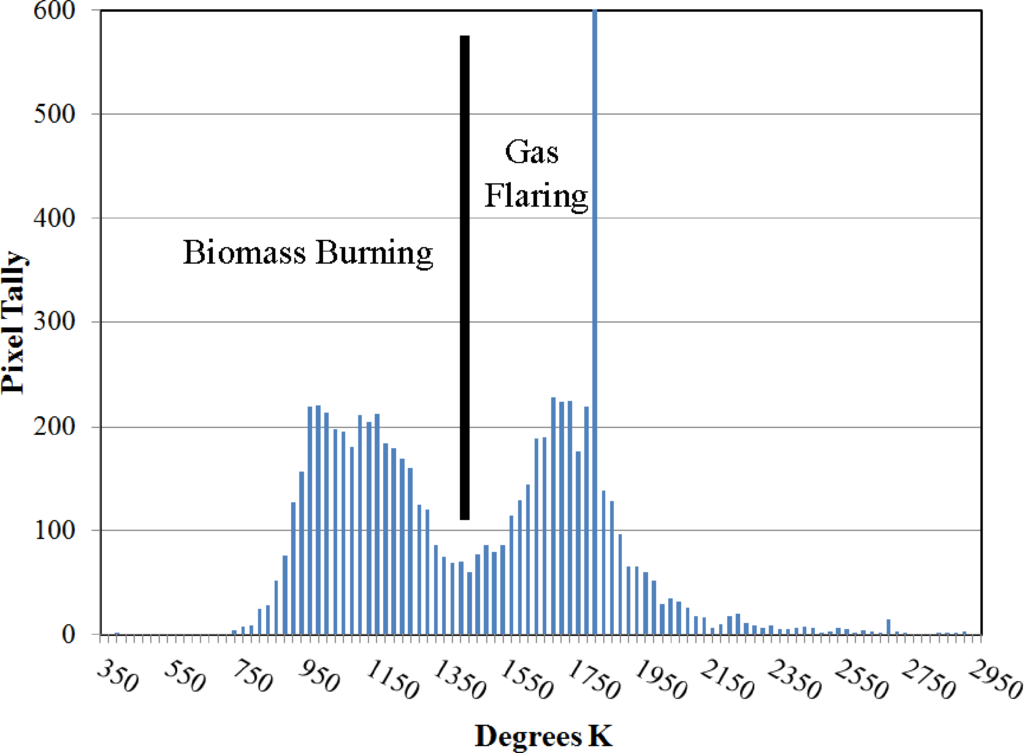 It could be argued that observations of combustion sources after midnight are of limited value. The majority of fires start during daytime hours when ambient temperatures and human activity levels are higher. Thus, the after midnight overpass of the SNPP likely under represents the extent of biomass burning. There are no known diurnal patterns known for gas flaring, which is the other type of phenomenon widely detected in Nightfire data. The advantage of Nightfire over other global fire observation data sources is the ability to consistently model Planck curves from sub-pixel heat sources over a wide span of temperatures. To our knowledge, it is the only satellite fire detection system which estimates temperature and source size for biomass burning, gas flares, and volcanoes worldwide on a daily basis.