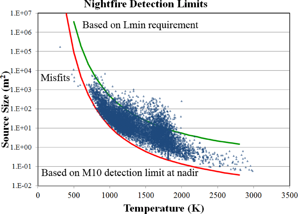 Nightfire detection limits are defined by the minimal detectable radiance of the M10 spectral band at night. Since the radiances detected in M10 are entirely from the hot sources present in the pixel footprint, the M10 minimal detectable radiance can be used to define the source area required to achieve a detection for any given temperature. Figure 8 shows a plot of a full day of Nightfire temperatures and source area estimates. Note there is a zone below the data cloud that is devoid of detections. The detection limit (red line) has been modeled with the typical nadir M10 detection limit and Planck’s Law by calculating the source size required to generate a detectable M10 radiance for temperatures ranging from 500 to 2,800 K. The modeled detection limit falls along the lower surface of the data cloud, indicating that Nightfire’s detection limits closely match the theoretical limits based on the M10 detection limit. The detection limit line shifts slightly upward at the edge of scan due to the gradual increase in the pixel footprint size and the increase in the M10 detection threshold, as discussed in Section 2.1. Modeled source area detection limits at nadir for a range of temperatures are shown in Table 2. The lower detection limit for Nightfire is estimated at 500 K, which is the temperature where a full pixel hot source (ESF = 1) would be required to generate a M10 detection at nadir.