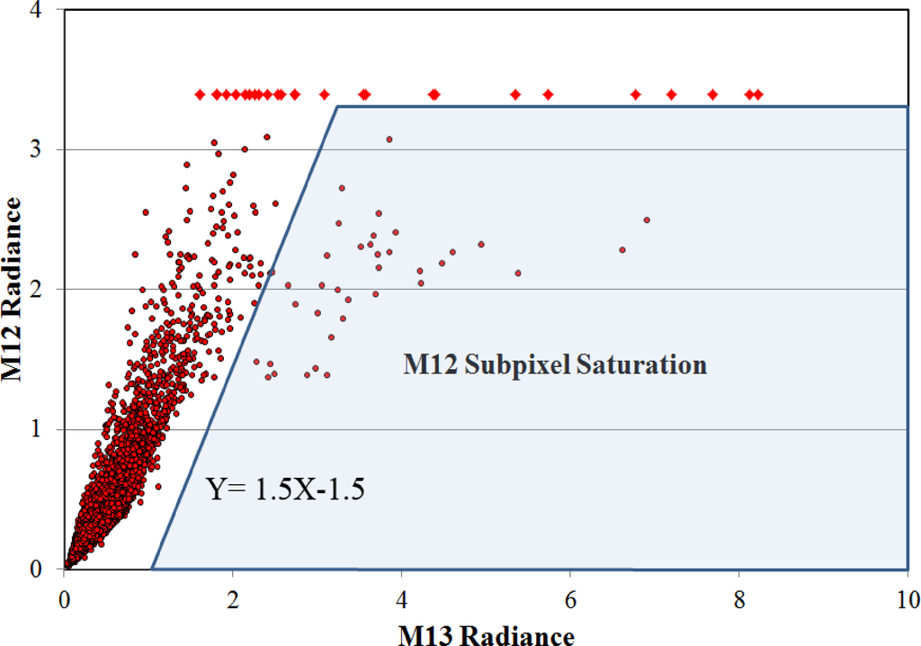 The only spectral band where an indication of saturation has been found for pixels containing hot sources is M12—centered at 3.8 μm. The M12 saturation radiance is 3.39 W/(m2·μm·sr), somewhat higher than the 2.84 requirement listed in Table 1. However, there can be sub-pixel saturation in aggregation zones 1 and 2 (Figure 3). Averaging saturated and unsaturated pixels results in radiances below the saturation radiance. Figure 9 shows M13 vs. M12 radiances for confirmed hot pixel detections from 4 April 2013. There is a line of pixels saturated in M12 pegged at radiances of 3.39. These were correctly indicated as saturated in the SDR quality flags. Nearly all of these fully saturated pixels are from the third aggregation zone (single pixel collections) and in this case none are from aggregation zone one (three pixel aggregation). On the right side of the chart there are pixels that are low in M12 relative to M13, falling away from the primary data cloud. All of these pixel are from aggregation zones one and two (Figure 3). These pixels did not have their SDR quality flag set for sub-pixel saturation. Examination of the full spectra for these pixels indicates that they are affected by sub-pixel saturation in M12, with anomalous dips in M12 radiance relative to M10 and M13. Currently, the pixels with M12 sub-pixel saturation are identified as falling in the shaded area on Figure 9. A quality flag is set in the CSV for pixels falling in this zone and the M12 radiance is excluded from the Planck curve fitting.