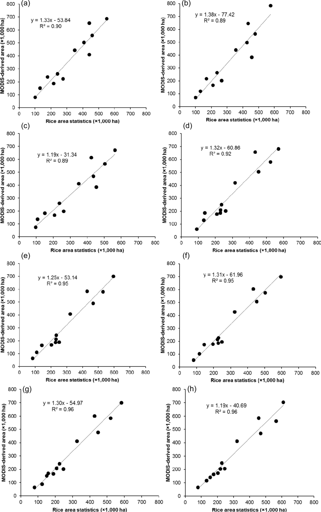 The relationship between the MODIS-derived rice areas and those from the government’s rice area statistics at the provincial level for each year was examined. The results showed that the two datasets were strongly correlated, reaffirming the consistency with the results achieved from the accuracy classification assessment using the error matrix. The correlation coefficient (R2) used to measure the adequacy of the regression model (Figure 7) indicated that the models could explain more than 80% of the variability in the data. In general, the classification results were slightly overestimated for all cases. The relative error in area (REA) between the MODIS-derived rice areas and the government’s rice area statistics ranged from 0.9–15.9% (Table 2). This overestimation error was mainly attributed to the discrepancy between the two datasets; the government rice statistics were estimated as the total sown areas in which multiple rice crops were double- or triple-counted, while the MODIS-rice areas were calculated by taking the pixel counts multiplied by the double- or triple-cropped counts. The errors were exaggerated because the double- and triple-cropped rice systems were commonly practiced throughout the region.
