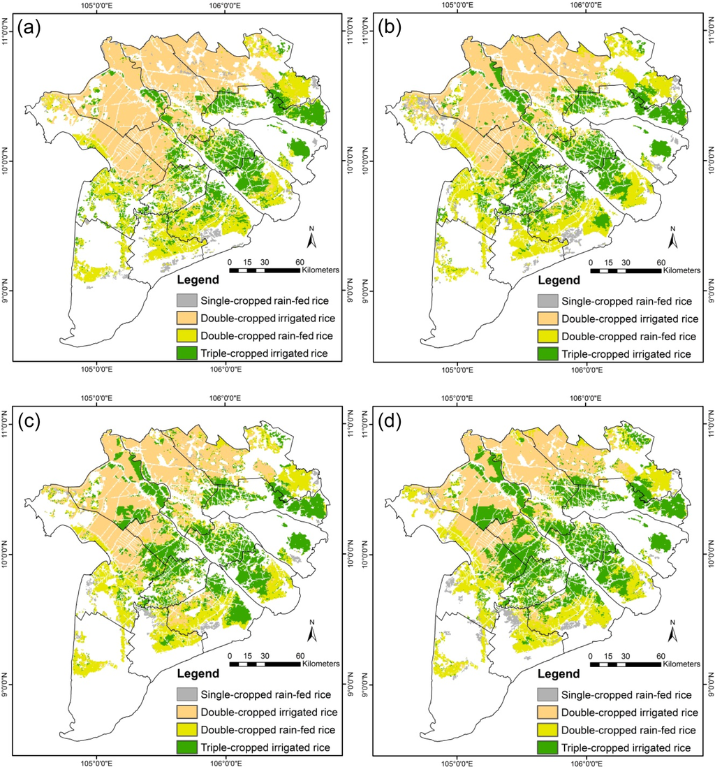 A decadal survey of the spatiotemporal evolution of rice cropping activities from 2001 to 2012 indicated that the double-cropped irrigated rice was concentrated in the upper part of the study area (Figure 8). The triple-cropped irrigated rice was particularly allocated along the central part of the region between the two large rivers (Mekong and Bassac rivers), due to the availability of water for crop irrigation around the year. The double-cropped rain-fed rice was distributed along the coastal zones, where water was limited during the dry season for rice crop irrigation. The single-cropped rain-fed rice invariably practiced during the rainy season was especially scattered along coastal areas, where soils were the major constraint for irrigated rice production.