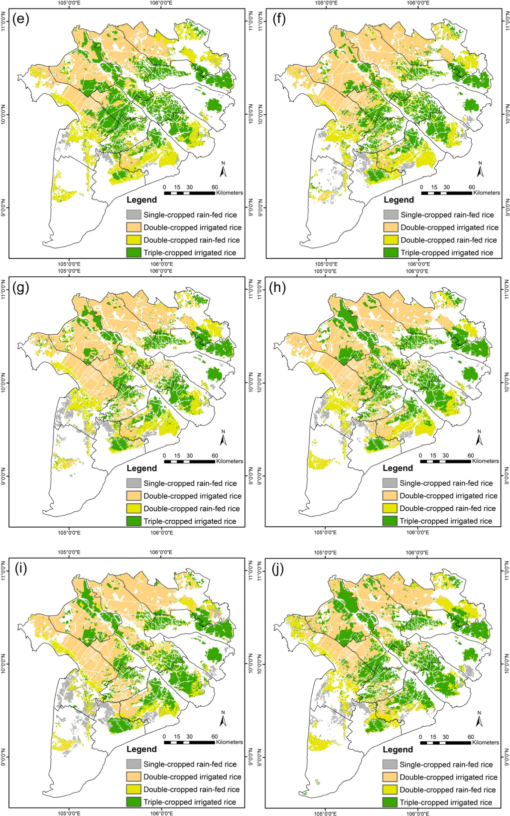 Spatial distributions of rice cropping systems in the study area: (a) 2001, (b) 2002, (c) 2003, (d) 2004, (e) 2005, (f) 2006, (g) 2007, (h) 2008, (i) 2009, (j) 2010, (k) 2011 and (l) 2012.