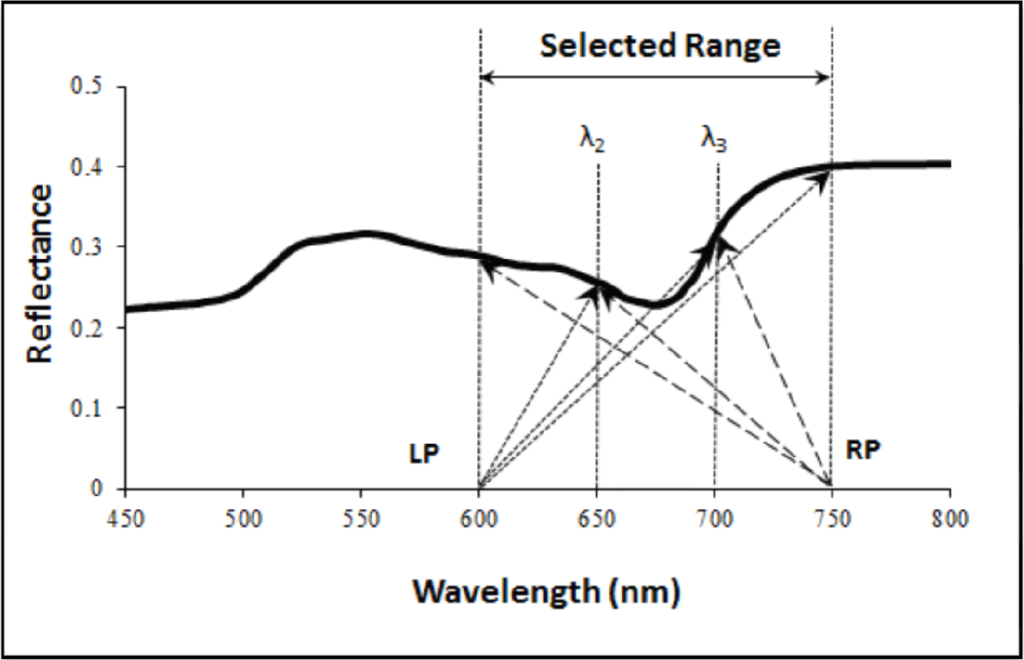 MD Index schematic diagram for spectral reflectance curve. Note that the number of points between LP and RP pivots can vary depending on the spectral resolution and the width of the selected range.