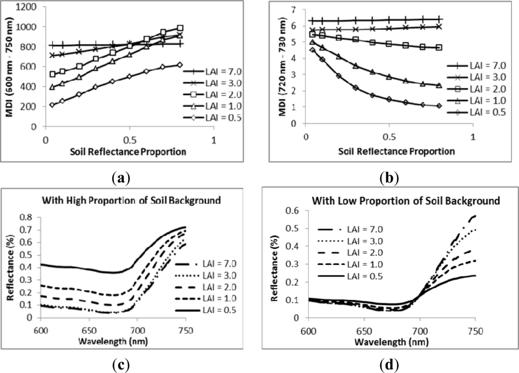 Relationships of MDI against soil background reflectance in varying levels of LAI for PWR (a) 600 to 750 nm and (b) 720 to 730 nm. No background effect has been observed using the red-edge spectral range, especially for LAI equal to 2 and higher. (c,d) spectral curves are affected by proportions of soil background at varying levels of LAI.