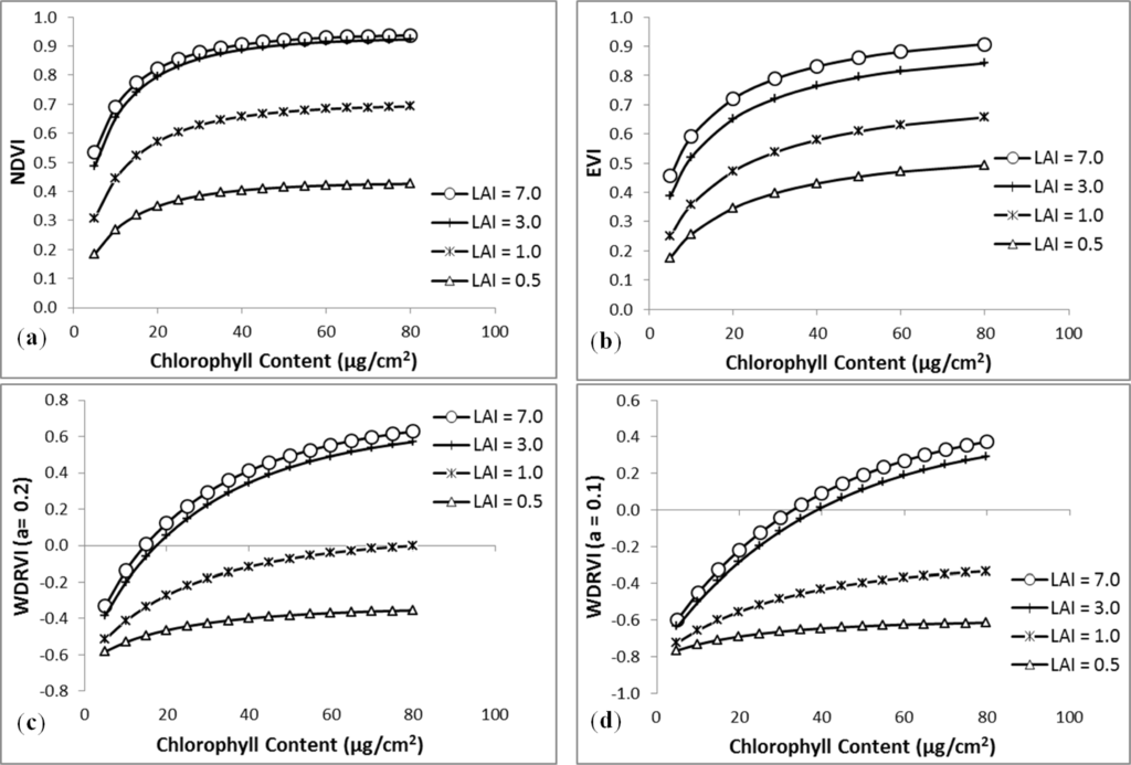 For comparison, we used existing VIs such as the NDVI, EVI, WDRVI, CI, and CVI and checked their relationships against the chlorophyll content. We averaged spectral bands to represent NIR (750–850 nm), red (600–700 nm), blue (400–500 nm), and red-edge (690–725 nm). Figure 11 confirms the previous findings of NDVI losing sensitivity (Figure 11a) at high chlorophyll content [2]. The linear behavior of the CIred-edge and CVI against the Chl (Figure 11e,f), respectively) is similar to that in Figure 4b for MDI(720–730nm) vs. Chl. Akin to NDVI, WDRVI tended to lose sensitivity as well (Figures 11c,d), but at a much higher Chl content. EVI (Figure 11b) also lost its sensitivity at increasing Chl content. However, EVI exhibited a linear trend against Chl at a very low level of LAI (LAI = 0.5).