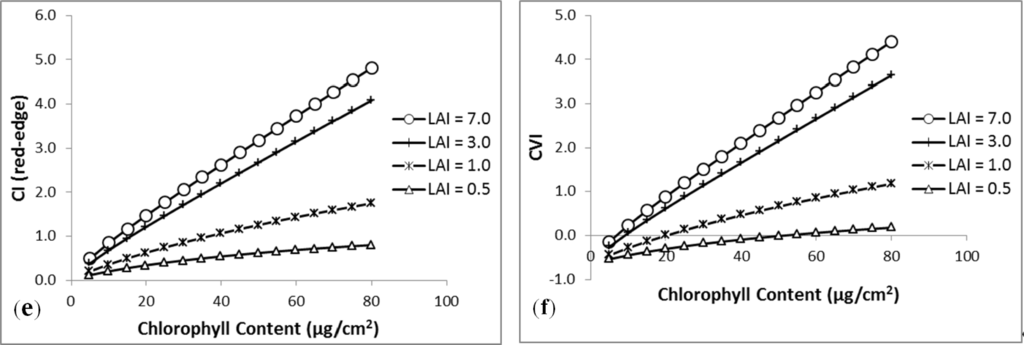 The sensitivity analysis (Figure 13) complements the trends shown in Figure 11. MDI(720–730nm) is the best method in estimating Chl, especially at high Chl amounts (Chl > 40 μg/cm2). Also, MDI(720–730nm) is comparable with CVI and CIred-edge showing sensitivities of both indices to Chl interchanging at varying LAI.