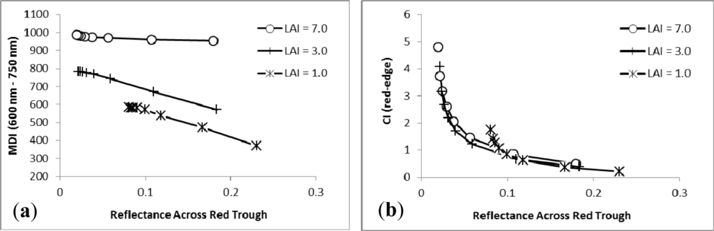 Magnitude of the reflectance across the red trough falling between the 600 nm to 750 nm against (a) MDI(600–750 nm) (b) CIred-edge. CIred-edge loses sensitivity at higher trough reflectance.