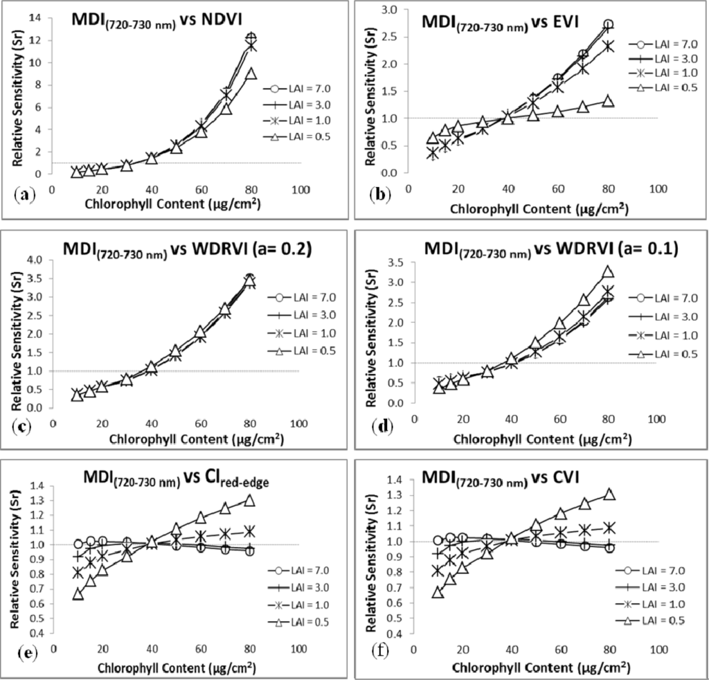 Relative sensitivity (Sr) of MDI(720–730nm) to chlorophyll. Sr < 1 means that (a) NDVI or (b) EVI or (c) WRDVI (a = 0.2) or (d) WRDVI (a = 0.1) or (e) CIred-edge or (f) CVI is more sensitive than MDI to changes in Chl contents. Sr > 1 indicates MDI being more sensitive than the tested indices.