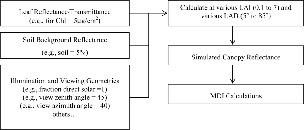 The online collection at the USGS Digital Spectral Library splib06a ( http://speclab.cr.usgs.gov; [69]) provides reflectance spectra from various types of soil and provided the range of plausible background reflectances for our simulations. We took zero as the minimum value and increased the influence to a maximum of 80% background reflectance (in steps of 5%) to cover the highest amount of soil effect to the top-of-canopy reflectance. Figure 3 shows a simple schematic diagram: from the simulations to the derivations of the MDI.