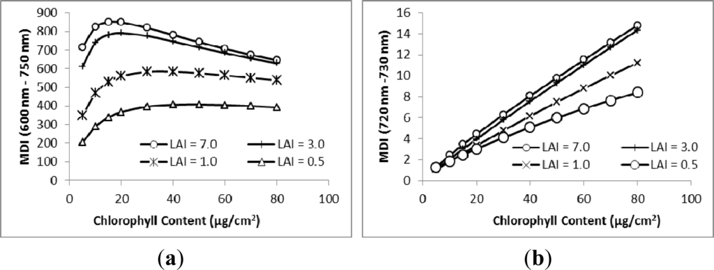 The comparison between the MDI from 600 to 750 nm (MDI600–750 nm) and that from 720 to 730 nm (MDI720–730 nm) at increasing Chl is shown in Figure 4. Both show that at canopy level, small values of MDI are associated with small values of LAI. There is peaking of MDI observed in Figure 4a, at around Chl = 25 μg/cm2, before MDI decreases at increasing Chl. MDI(600–750 nm) tends to lose sensitivity at very high values of LAI and Chl. The peaking is not evident in the shorter, more specific red-edge region at 720 to 730 nm. Figure 4b shows a strong linear relationship between MDI and the Chl content at different levels of LAI. At low Chl content (e.g., Chl = 5μg/cm2), MDI values range from 1.27 to 1.31.