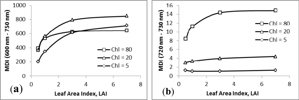 Relationships of MDI against LAI for PWR (a) 600 to 750 nm and (b) 720 to 730 nm. Note how the MDI computed from 600 to 750 nm PWR loses sensitivity around LAI = 3. The range 720 to 730 nm, however, tends to minimize the LAI influence.