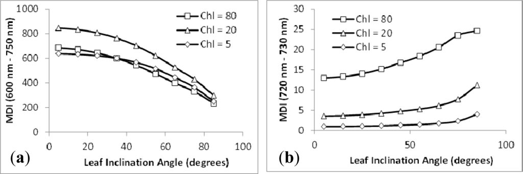 Evident in Figure 6a,b are the differences in MDI trends in terms of the leaf inclination. Leaf angle affects the MDI at all degrees of leaf tilting for MDI(600–750 nm) (Figure 6a). MDI falls to smaller values at increasing angle. Figure 6b conveys a different story with the shorter PWR, MDI(720–730 nm), as being less affected by leaf inclination angles. Minimal effects are observed on planophile than erectophile leaves. The leaf inclination angles only began to have effects at 55° angle in low chlorophyll contents.