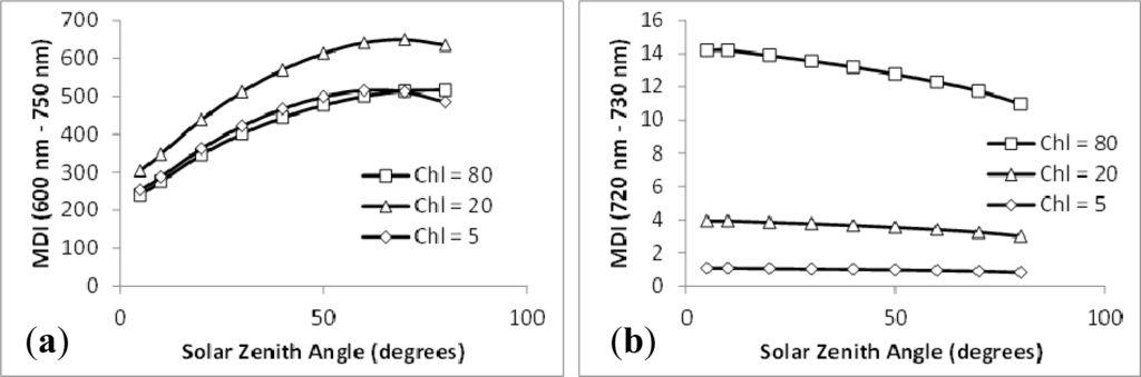 The PWR 600 to 750 nm is sensitive to solar zenith angle, especially at low angles (Figure 7a), with MDI leveling off at high degrees of zenith. For the 720 to 730 nm PWR, the red-edge MDI is minimally, if not affected, by zenith angle variations (Figure 7b).