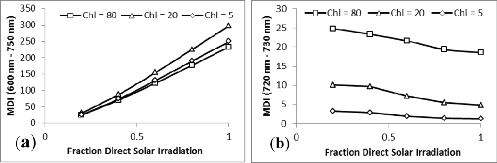 Between the two diagrams in Figure 8, the fraction of direct solar irradiation (FDSI) is linearly related to the MDI(600–750 nm) (Figure 8a). The FDSI has minimal to no effects on the MDI at the red-edge feature of the spectrum (Figure 8b).