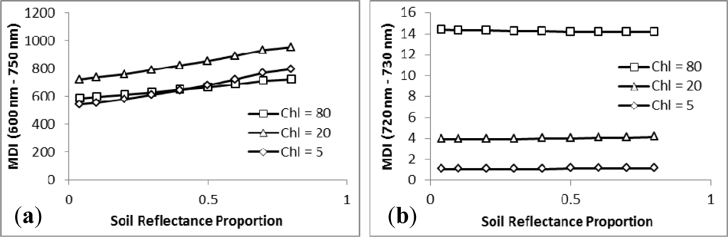 There are two reasons for the reasonably good agreements of the MDI(720–730 nm) against the Chl. First, apart from the fact that the region lies in the essential vegetation spectral shift from red to NIR, the MD approach accounted for specific details of the curve at a high spectral resolution (simulating at 1 nm intervals). Second, the region is less sensitive to spectral noise caused by the soil background and by atmospheric effects [78,79]. In fact, the soil background has rather minor effects on MDI(720–730 nm). The utility of the 720–730 nm region may be compromised, however, by the effects of very low LAI and very high soil reflectance (Figure 10). Though it is shown that the influence of LAI is minimized even at low LAI values, the simulations indicate that MDI(720–730 nm) may work best for higher values of LAI, starting around LAI = 2 to 3, when the soil background reflectance becomes less significant.