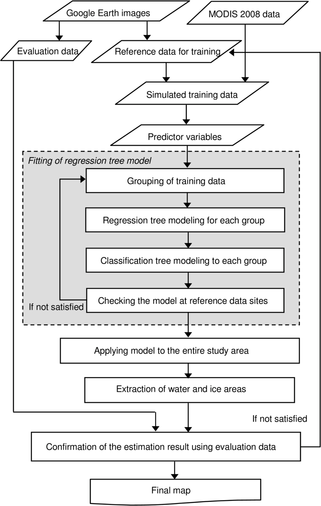 The model among them with the best fit to reference sites was adopted as the final model. When the estimation result was not good for some reference sites, fitting of a regression tree model and modification of grouping training data was conducted again. Water and ice areas were classified independently using See5 software as the percent tree cover estimated by Cubist was not good when the simulated training data made of these two classes were used. These two areas were set to 0% tree cover.