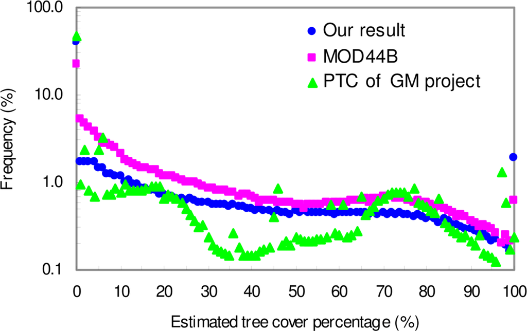 As our validation method had some problems as described above, we assessed our result and other two maps in randomly sampled pixels, where the difference of the estimation between them was greater than 50%. This was because it was difficult to get the accurate reference data in randomly sampled pixels with the estimation error of less than 50%. Our estimation result was more coincident with the reference data interpreted from images in Google Earth than other two datasets. However, several pixels were difficult to judge because some pixels were on the border of different land cover types and some pixels were difficult to distinguish trees from other vegetation. The statistical analysis showed that no artificial characteristic was included in the total number of pixels in our estimation as occurs with PTC of GM project, which had many pixels at the specific values of tree cover percentage. The original MOD44B had almost no pixels whose tree cover was greater than 80% because of the limitation of training data. In MOD44B, tree canopy cover was used for the definition of tree cover instead of tree crown cover. Canopy cover is the crown cover excluding gaps inside the crown. For this reason, tree-cover percentage in MOD44B was divided by 0.8 in this assessment. It is noteworthy that the resolution, the year, and the data used for the generation of products differed among the three maps.