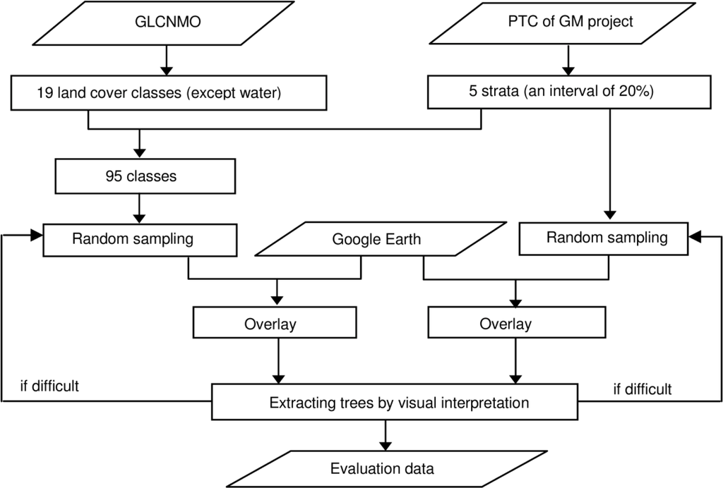 The judgment of tree characteristics was based mainly on color and texture. The presence of shadows was used to distinguish a tree from a shrub. As most of the sites with greater than 60% tree cover were classified as forest in GLCNMO, another 50–60 sites for each stratum were also randomly sampled, leaving the land cover class out of consideration to obtain more than 100 evaluation sites for each stratum of the observed tree cover percentage. For the evaluation data, totally, 716 sites were collected (Figure 2). Confirmation that the tree-cover percentage of the acquired high-resolution images in Google Earth is almost identical to the percentage at the peak of the growing season in 2008 was made by comparison with the temporal profile of Normalized Difference Vegetation Index (NDVI) data calculated from MODIS data in 2003 and 2008. All sampled sites were also examined by comparison with Landsat images to ascertain the possibility of the change of the tree cover percentage. A flowchart of these steps is presented in Figure 3.