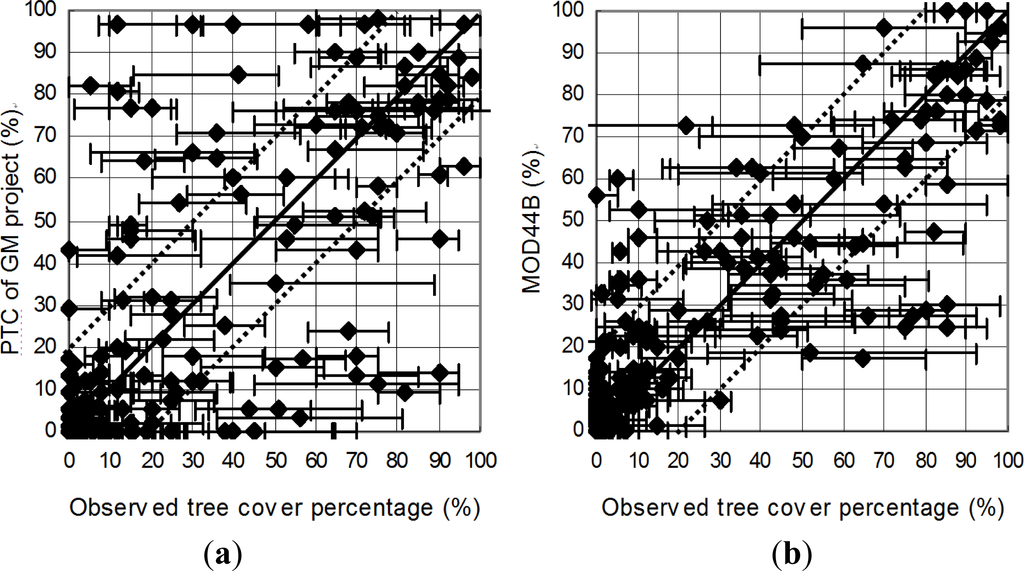 Scatterplot of the observed versus estimated tree cover percentage for validation data. (a) is the single-pixel level validation; and (b) is validation using a 3 × 3 pixel window. Validation data were randomly sampled. The horizontal error bars show the range of minimum and maximum visually interpreted tree cover percentage of images in Google Earth. The diagonal shows a linear 1:1 relation; dotted lines show the range of 20% error.