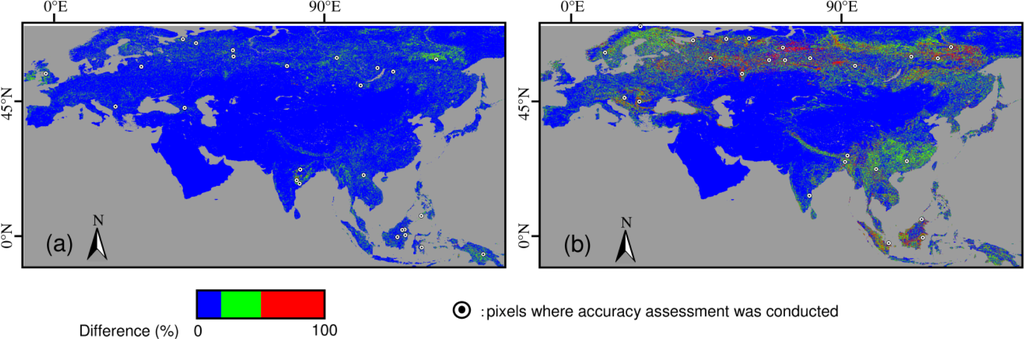 Difference map between our resultant tree cover estimation map and MOD44B (a) or PTC of GM project (b). Pixels of MOD44B and our map were resampled into the same position and size of PTC of GM project.