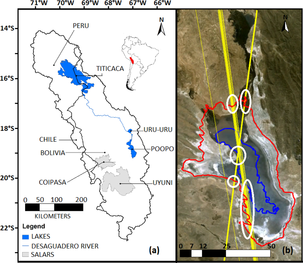 Lake Poopó, (a) geographical overview, (b) Ice, Cloud, and land Elevation Satellite (ICESat) ascending and descending tracks (yellow lines) over Lake Poopó. White circles represent zones where ICESat elevation is intersected with water contours. Maximum (red) and minimal (blue) water extents of our bathymetry are shown.