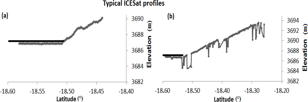 In Figure 2, typical ICESat profiles from the northern part of Lake Poopó are shown. Water surface can be identified in the lowest part of each profile. Several outliners’ points with differences of 20 to 40 cm to the water level can be attributed to waveform saturation [43].