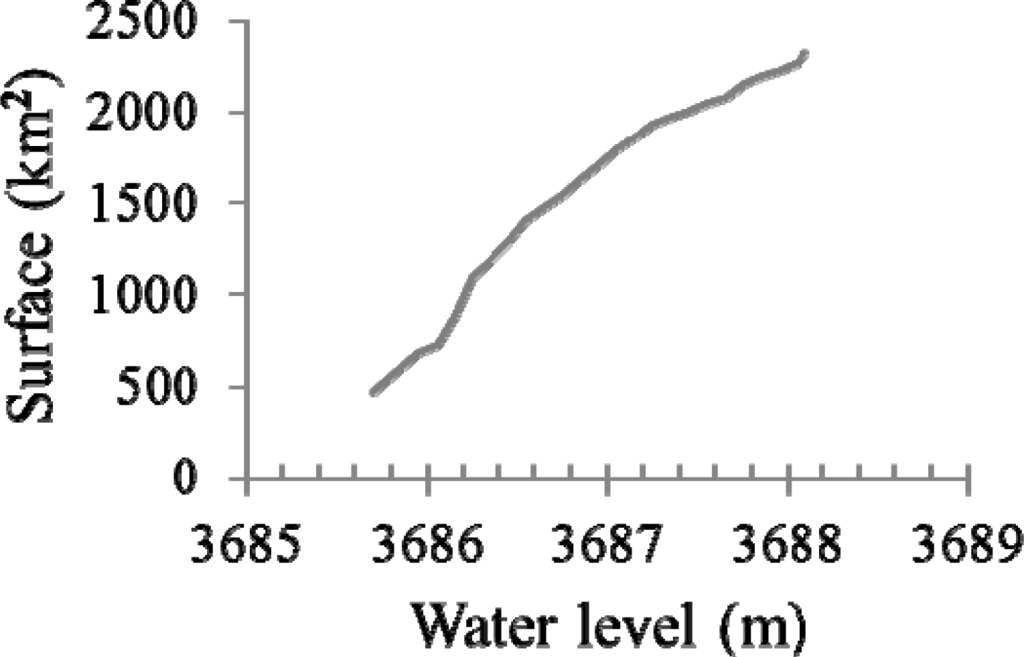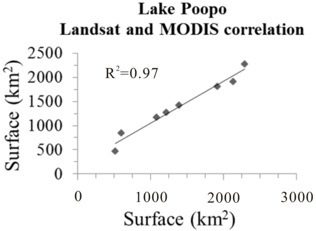 Lake Poopó hypsometry is presented on Figure 4. The lowest surface attributed to the 3,685.70 m elevation (ICESat 5 October 2009 flyover) is 467 km2 while the highest point on the curve has 3,688.10 m of elevation for a surface of 2,316 km2. The MODIS surfaces (Figure 5) are linked to bathymetry through the Landsat/MODIS calibration curve (Figure 6) and a correlation coefficient of R2 = 0.97 was obtained.
