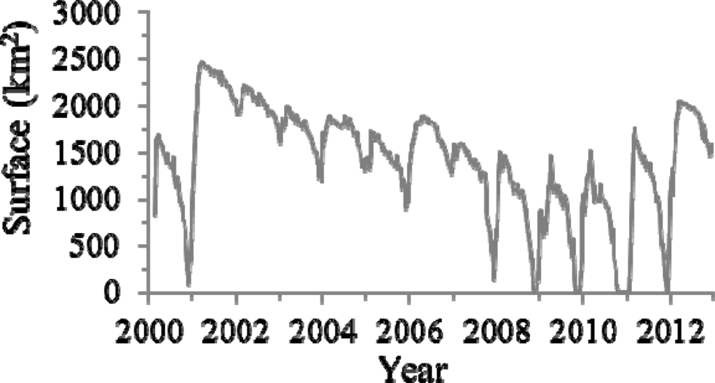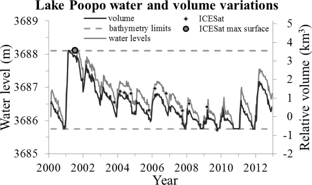The bathymetry combined with MODIS time series is used to calculate Lake Poopó water levels and water storage (Figure 8). We can observe that lake maximum water storage is always reached between 1 March and 20 March each year. In March 2001 we observed the highest relative water storage. Minimum water storage can be observed at the beginning of November if only the water level in March is higher than 3,686.6 m (surface larger than 1,490 km2). When the water level in March was lower than 3,686.6 m then the minimum lake storage was reached during the 1st week of October as it has been observed in 2009, 2010 and 2011.